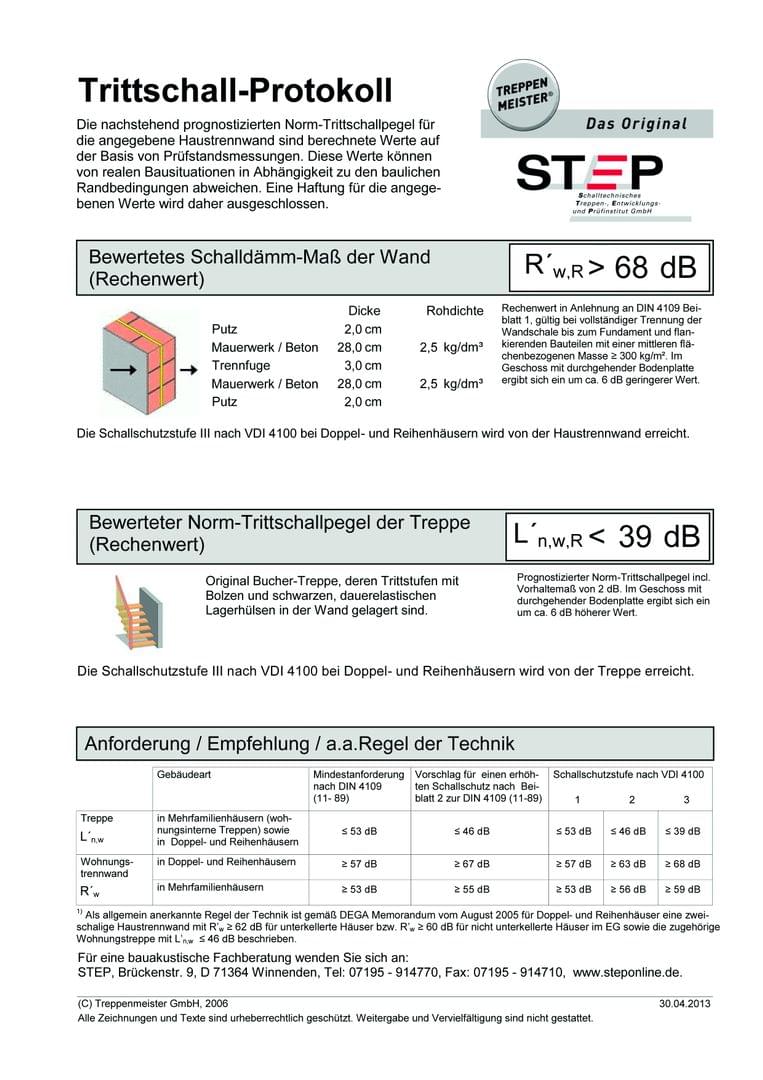 - Lassen Sie sich von Ihrem Treppenlieferanten nachweisen, welchen Trittschall Sie aufgrund der in Ihrem Haus vorgesehenen Trennwände erzielen werden zum Beispiel durch ein Trittschallprotokoll.
